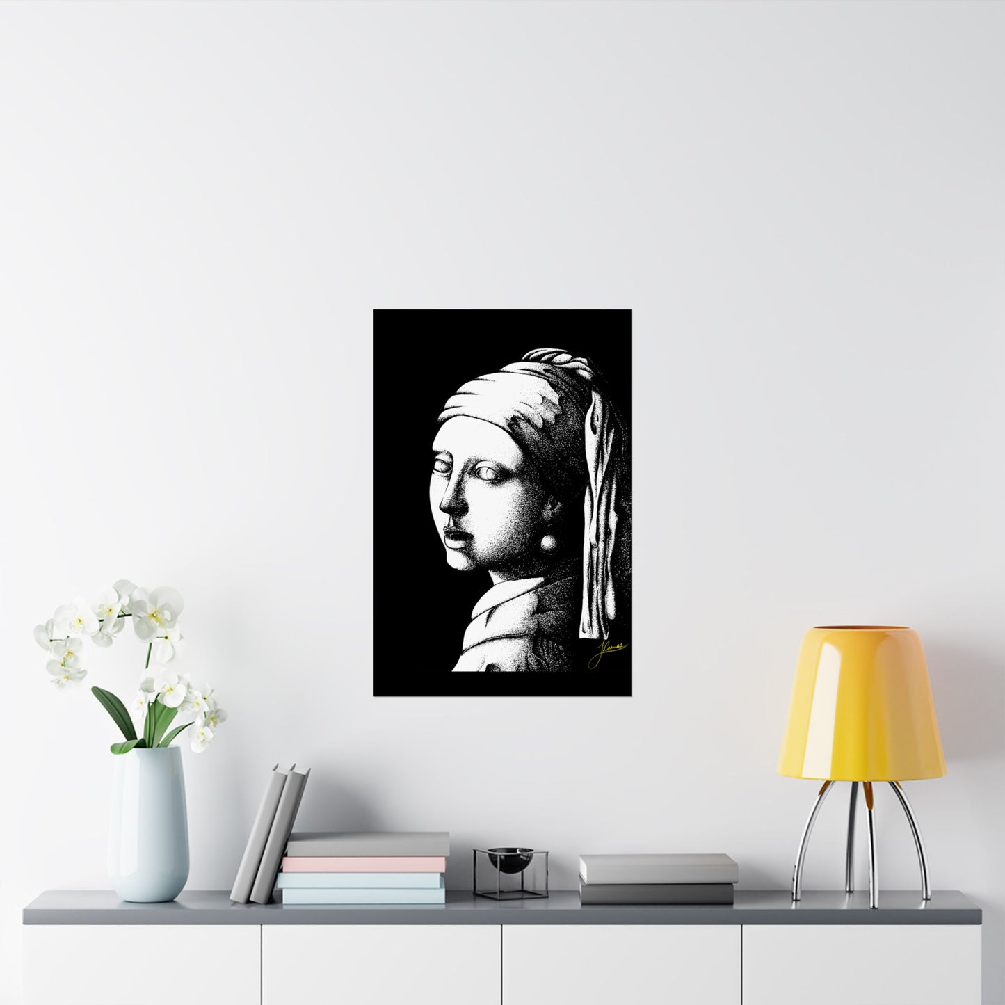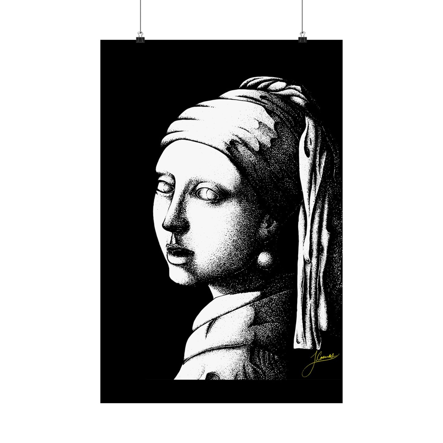 My own take on the famous painting "Girl with Pearl Earings" by the famous Dutch painter Johannes Vermeer. The dark background provides a wonderful pop for the spooky black and white woman who stares right into your soul. If you are a lover of weird art, spooky art, goofy art, or anything macabre, this will be a wonderful addition to your gallery!